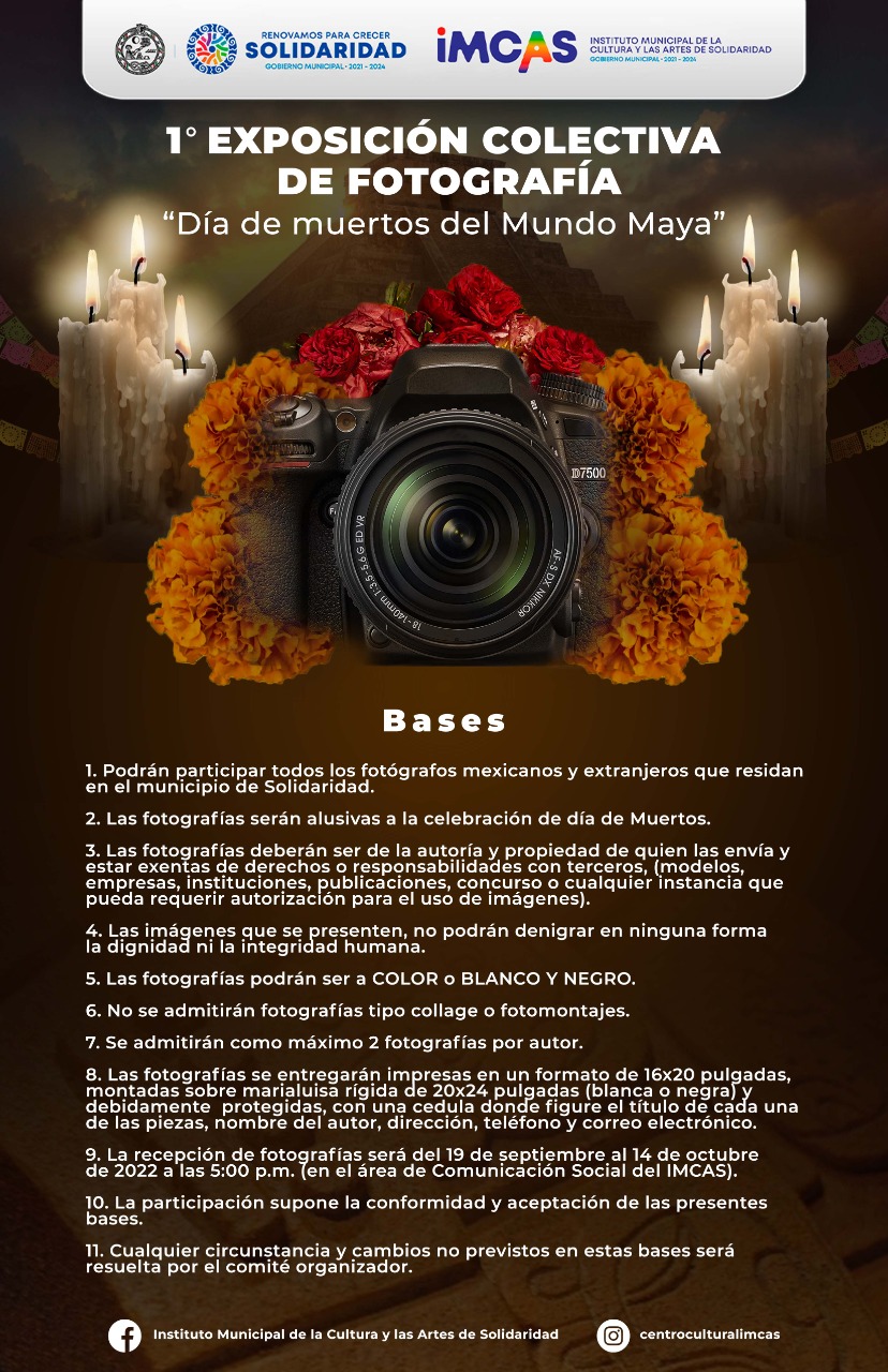Playa del Carmen, Solidaridad, 4 de octubre de 2022.- El ayuntamiento de Solidaridad, que preside Lili Campos, a través del Instituto Municipal de Cultura y las Artes (IMCAS) convoca a los aficionados y profesionales de la lente, que deseen sumarse a la primera exposición colectiva de fotografía con motivo de la celebración de los fieles difuntos.
