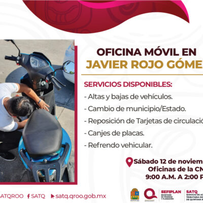El SATQ, a través de la Dirección de Recaudación de Othón P. Blanco, llevamos para ti la #OficinaMóvil para trámites de emplacamiento a Javier Rojo Gómez, este sábado 12 de noviembre de 9:00 a.m. a 2:00 p.m. en las oficinas de la CNPR.
