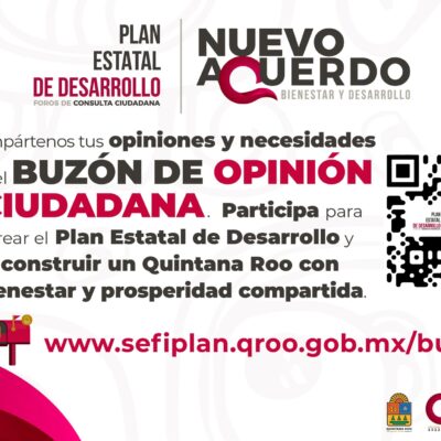 Hoy último día para participar en el #BuzónCiudadano que el Gobierno de Quintana Roo pone a su disposición para conocer tu opinión y propuestas, que permitirán ser parte del Plan Estatal de Desarrollo 2023-2027.