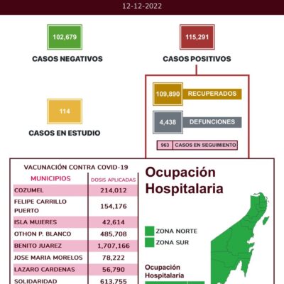 Hasta el 12 de diciembre de 2022 han sido 115 mil 291 casos positivos de COVID-19 en Quintana Roo.
