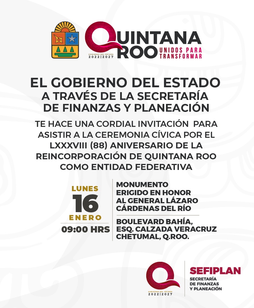 ✅Te invitamos a la Ceremonia Cívica por el 88 Aniversario de la Reincorporación de Quintana Roo como Entidad Federativa.