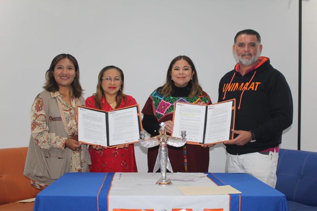 Cancún.-El Instituto Quintanarroense de la Mujer (IQM) y la Universidad UNIMAAT signaron un convenio de colaboración, para que estudiantes de carreras afines puedan realizar su servicio social y prácticas profesionales en todos aquellos temas que realiza el IQM en materia de igualdad y no violencia, así como de servicios integrales a mujeres.