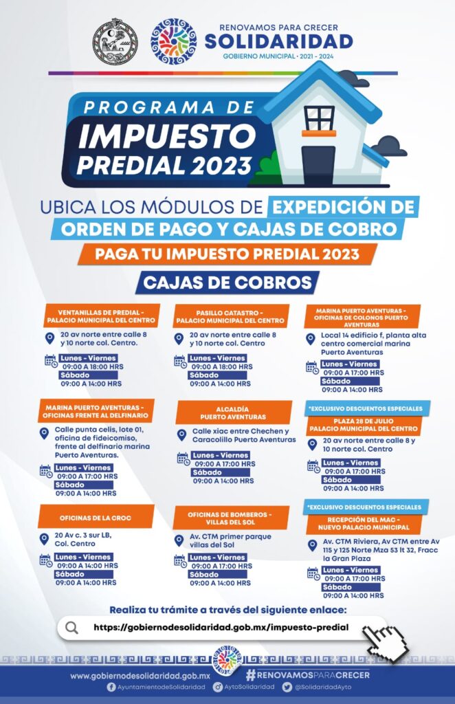 Pueden acudir a cualquier ventanilla del palacio municipal del centro, palacio municipal nuevo, oficinas de bomberos y de la CROC. En Puerto Aventuras, en la Marina y en la alcaldía, o bien pagar en línea directamente en la página oficial del Ayuntamiento de Solidaridad (gobiernodesolidaridad.gob.mx) donde podrán descargar el pase de caja, para lo que deben tener a la mano la clave catastral.