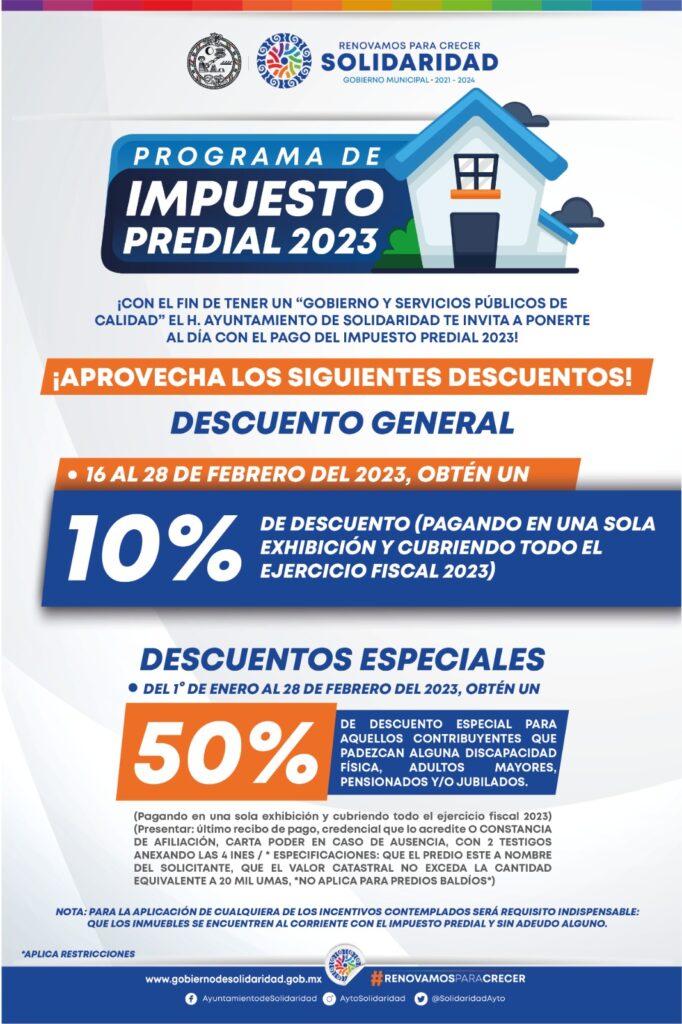 Para cualquier contribuyente que pague el impuesto predial 2023 en una sola exhibición, hasta el 28 de febrero será beneficiado con un 10% de descuento. En apoyo a los pensionados, jubilados, adultos mayores y discapacitados, se otorgarán descuentos especiales de hasta un 50%. En ambos casos deberán presentar el ultimo recibo de pago o clave catastral.