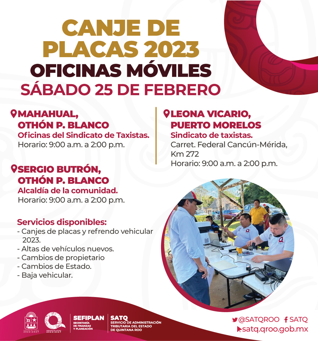 Este 25 de febrero contaremos con #OficinaMóvil en Othón P. Blanco y Puerto Morelos, localiza el módulo correspondiente al municipio en el cual está emplacado tu vehículo y acude. ¡Regularízate!