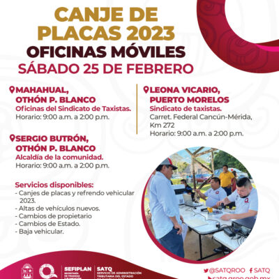 Este 25 de febrero contaremos con #OficinaMóvil en Othón P. Blanco y Puerto Morelos, localiza el módulo correspondiente al municipio en el cual está emplacado tu vehículo y acude. ¡Regularízate!