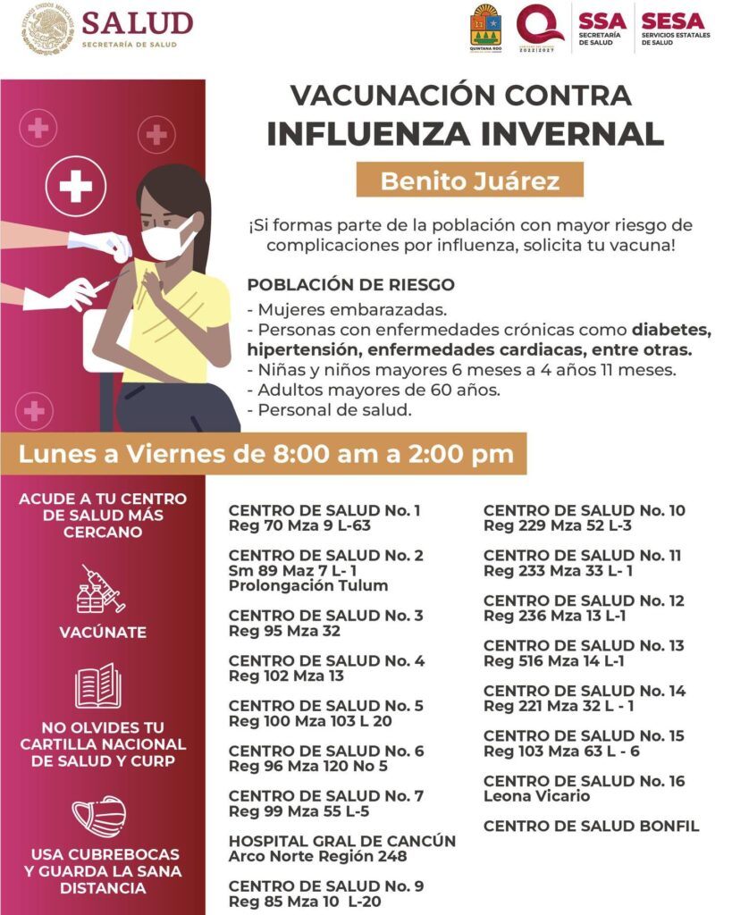 Amigas y amigos de #FelipeCarrilloPuerto, si formas parte del grupo con mayor riesgo de complicaciones en caso de enfermarte de influenza, acude a vacunarte en horario de 8:00 am a 2:00 pm a uno de los módulos disponibles. Tienes hasta el 31 de marzo.