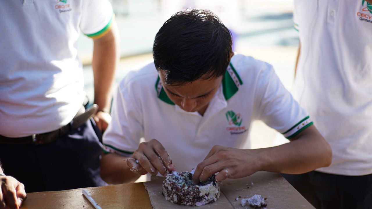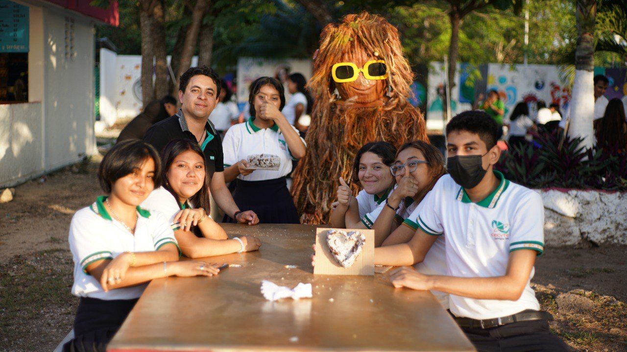 Alumnos de este colegio, en compañía de “Sargazin”, de la Secretaría de Medio Ambiente Sustentable y Cambio Climático y Zofemat, aprendieron el procedimiento para elaborar macetas a base de sargazo.