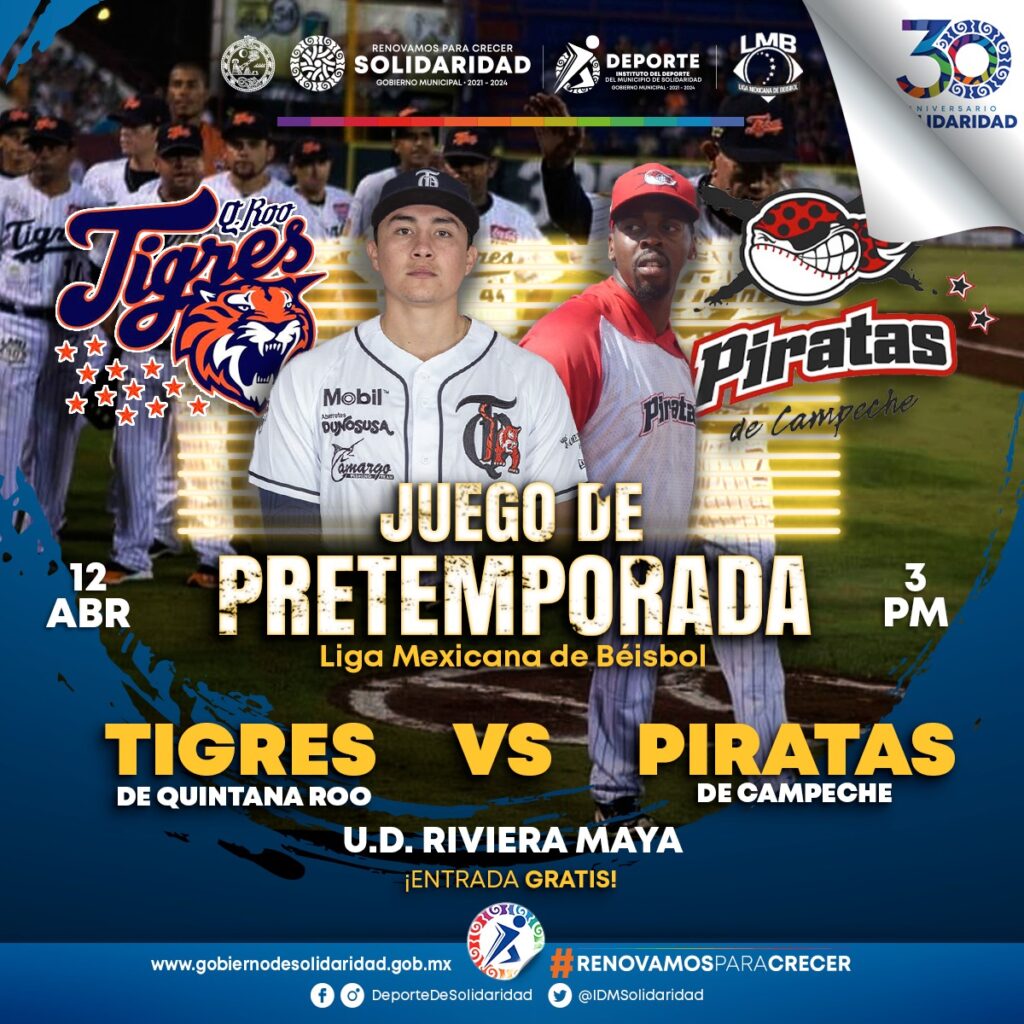 Playa del Carmen, Solidaridad, 5 de abril.- En impulso a la sana diversión y esparcimiento para las familias solidarenses por parte de la presidenta municipal Lili Campos, el próximo 12 de abril se realizará el juego de pretemporada de la Liga Mexicana de Béisbol entre los Tigres de Quintana Roo y los Piratas de Campeche.