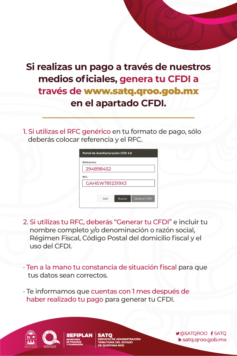 Ya está disponible en nuestro portal www.satq.qroo.gob.mx la facturación 4.0, si realizaste tu pago en nuestro portal de Tributanet, Tenencias o en nuestras oficinas, ingresa y genérala siguiendo estos pasos:
