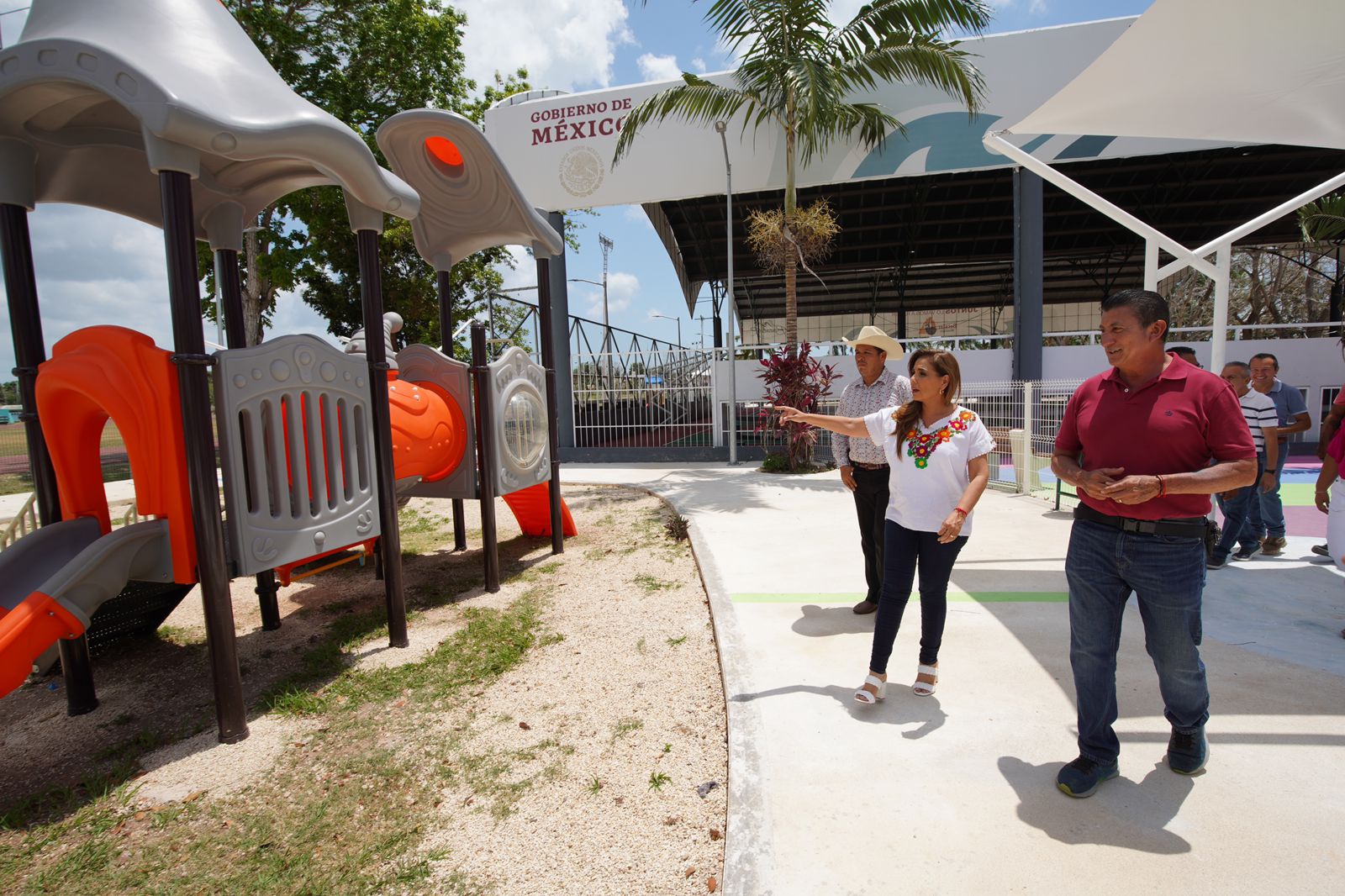 Bacalar.- La gobernadora Mara Lezama Espinosa anunció la próxima inauguración del domo doble de la unidad deportiva “Serapio Flota Mass”, durante una visita que hizo al lugar acompañada del presidente municipal José Contreras Méndez.