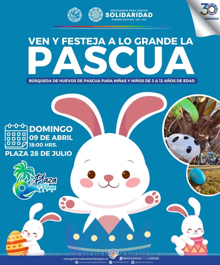 Playa del Carmen, Solidaridad, 7 de abril del 2023.- El gobierno de Solidaridad, que encabeza la presidenta Lili Campos, invita a participar en eventos de Pascua, con el objetivo de que locales, así como infantes nacionales y extranjeros que se encuentran en este destino turístico, conozcan las tradiciones de otras partes del mundo y realicen la búsqueda del tradicional huevo de Pascua.
