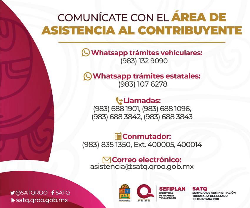 Si tienes alguna duda sobre trámites fiscales puedes comunicarte con un asesor de Asistencia al Contribuyente del @satqroo