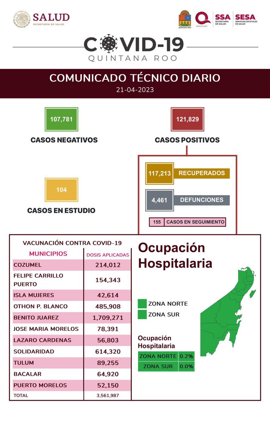 Hasta el 21 de abril de 2023 han sido 121 mil 829 casos positivos de COVID-19 en Quintana Roo