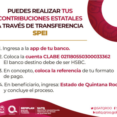 Si vas a realizar pagos de contribuciones estatales, puedes hacerlo vía transferencia SPEI