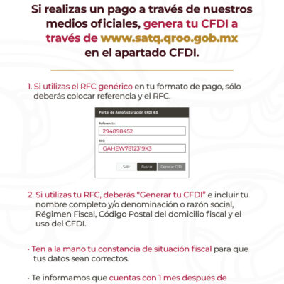 Ya está disponible en nuestro portal www.satq.qroo.gob.mx la facturación 4.0, si realizaste tu pago en nuestro portal de Tributanet, Tenencias