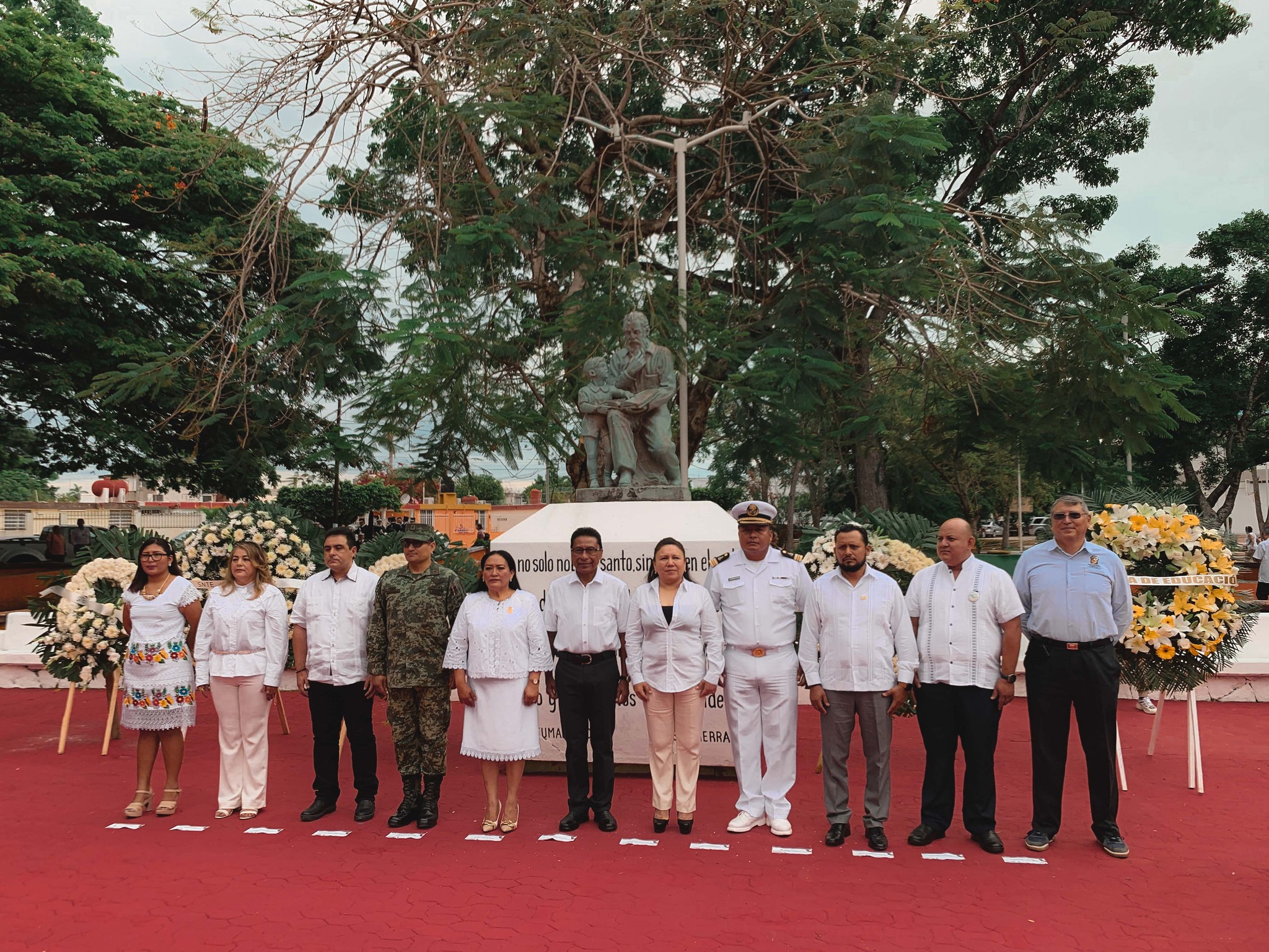 En la colocación de la ofrenda floral, en la que se contó con la participación especial de la Banda de Guerra del Instituto Tecnológico de Chetumal (ITCH); el Secretario de Educación, Carlos Manuel Gorocica Moreno, estuvo acompañado también por la representante de la XVII Legislatura del Congreso del Estado de Quintana Roo, la Diputada Elda Xix Euan; el Tesorero del H. Ayuntamiento de Othón P. Blanco, Miguel Zogby Cheluja Martínez; así como de maestras y maestros de los distintos niveles educativos en la Entidad.