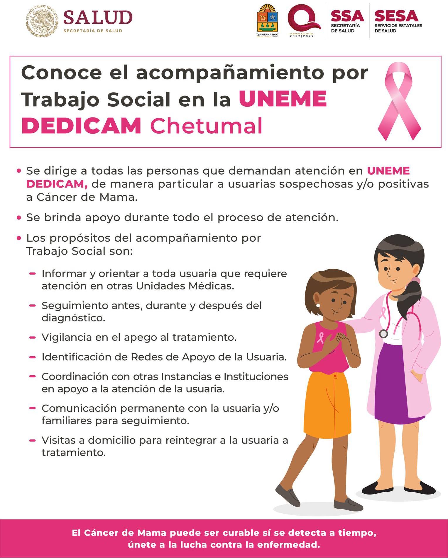El acompañamiento por trabajo social en la UNEME DEDICAM CHETUMAL Se dirige a todas las personas que demandan atención de manera particular a usuarias sospechosas y/o positivas a Cáncer de Mama