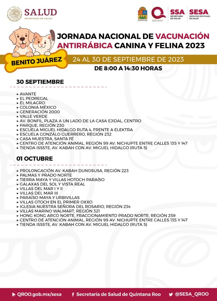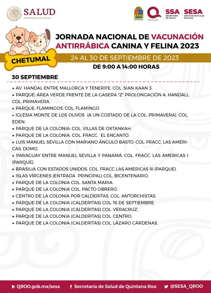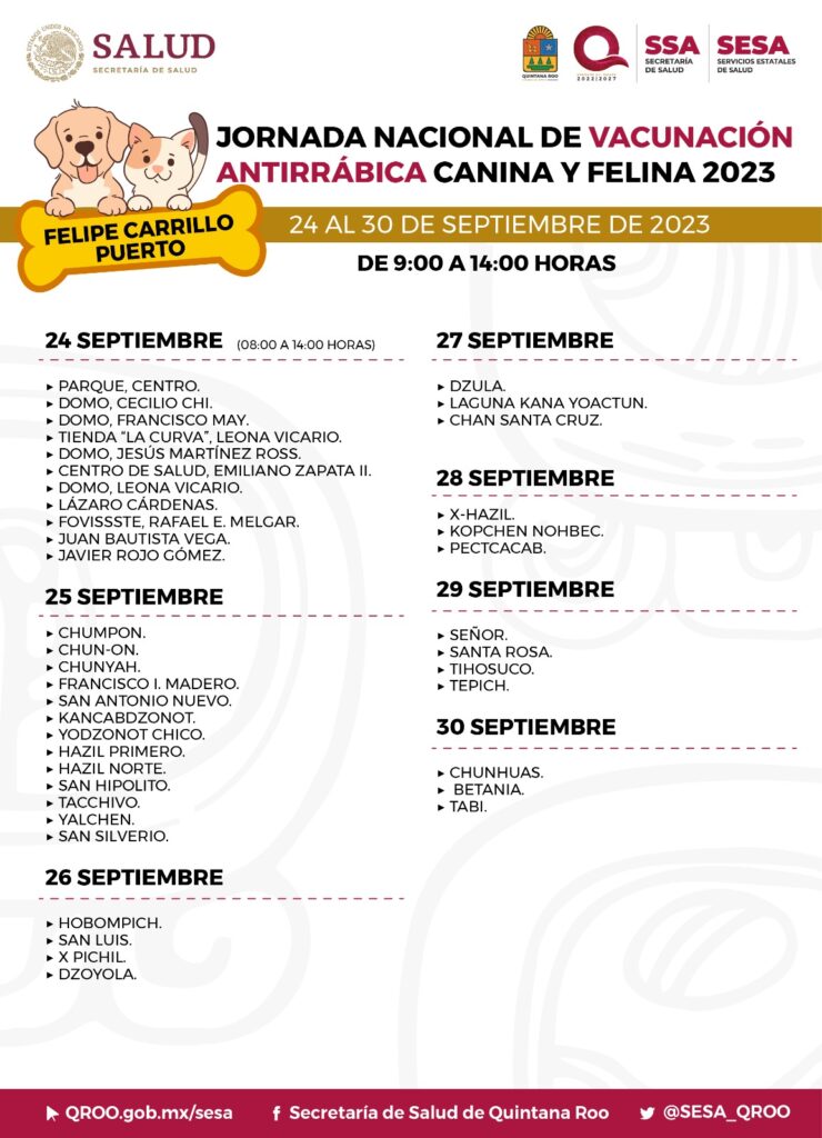 Chetumal.- Bajo el lema “Por tu salud y la de tu familia, vacuna a tus perros y gatos contra la rabia”, la Secretaría Estatal de Salud (SESA) realizará del 24 al 30 de septiembre “La Jornada Nacional de Vacunación Antirrábica Canina y Felina 2023”, por lo que se invita a toda la ciudadanía a llevar a sus mascotas a los puestos de inmunización.