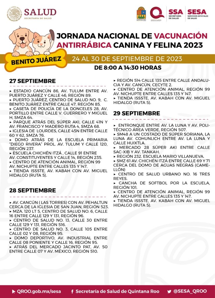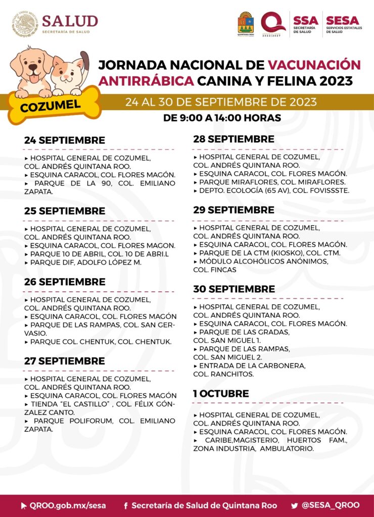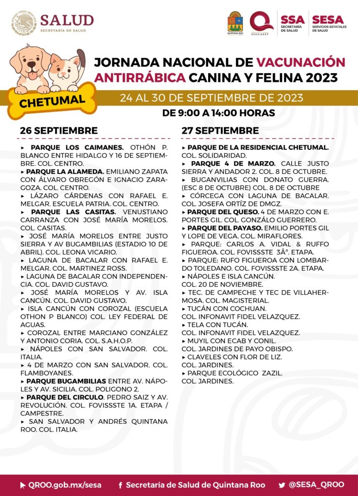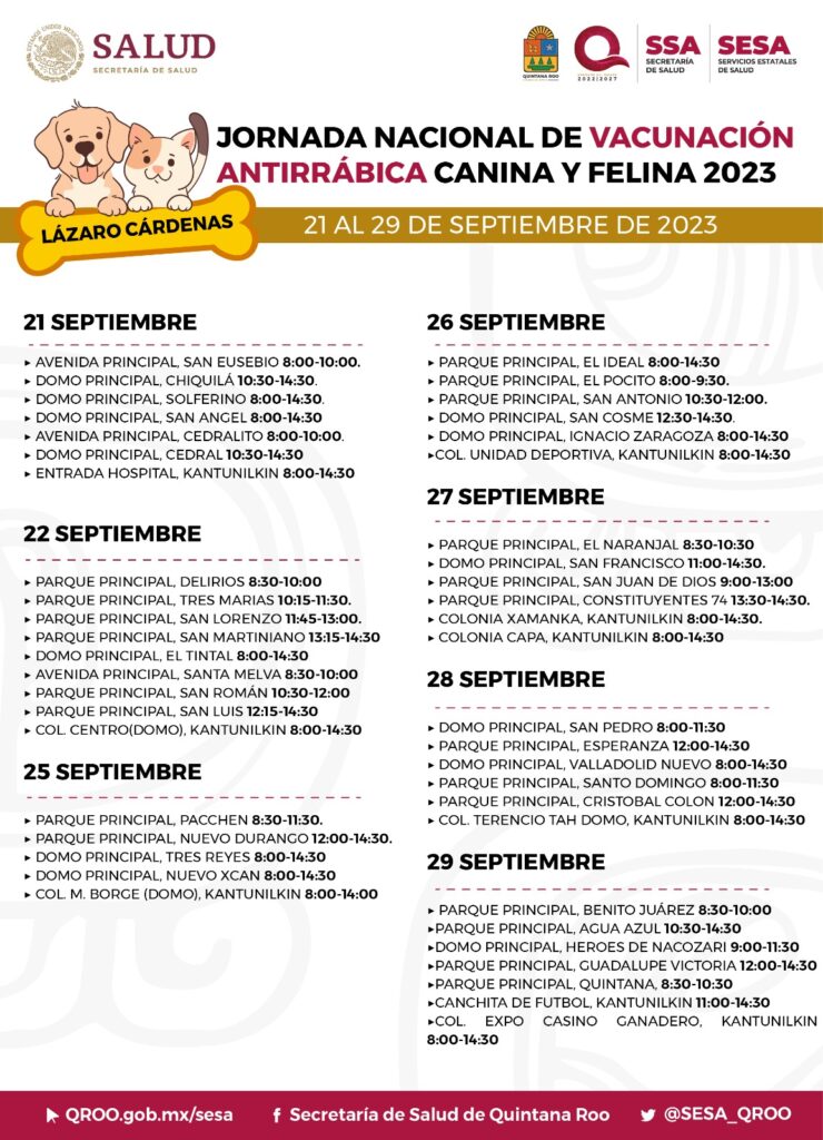 Al respecto, recomendó a la población consultar la siguiente página https://qroo.gob.mx/sesa/jornada-vacunacion-antirrabica para verificar la calendarización de los puestos de vacunación.