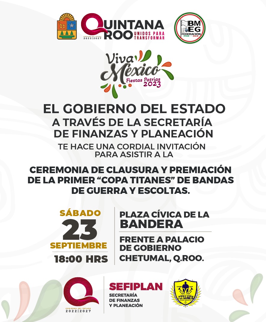 Celebra con nosotros las #FiestasPatrias2023, asiste HOY a la Ceremonia de Clausura y Premiación de la Primer #CopaTitanes de Bandas de Guerra y Escoltas.