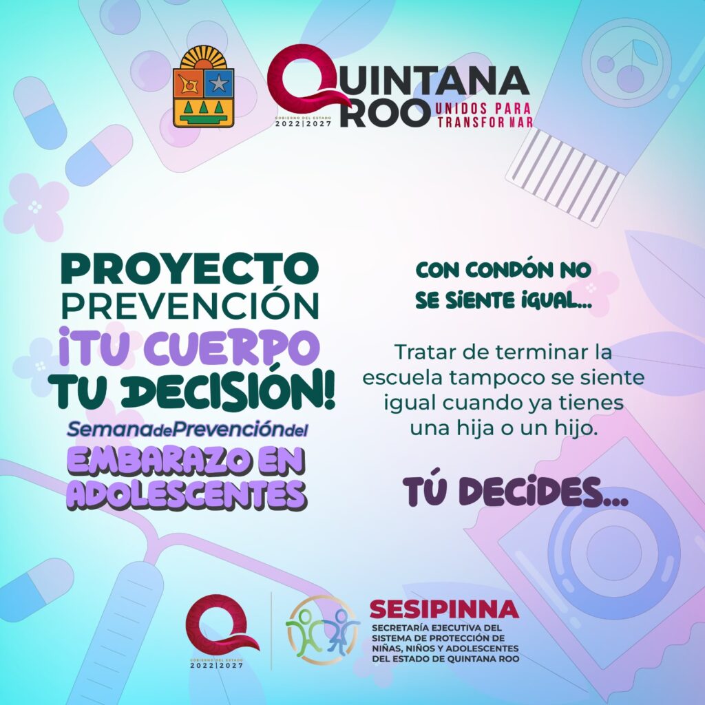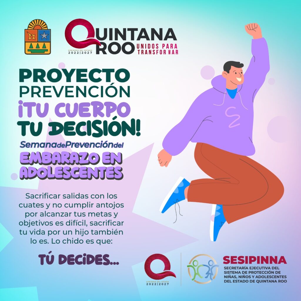 Chetumal.- La Secretaría Ejecutiva del Sistema de Protección de Niñas, Niños y Adolescentes (SIPINNA) del Estado de Quintana Roo lanza un llamado a dependencias, gobiernos municipales, asociaciones civiles, docentes y madres y padres de familia para sumarse a la campaña #ProyectoPrevención #TuCuerpoTuDecisión, con el fin de concientizar a las y los adolescentes acerca de la importancia de la planificación familiar.