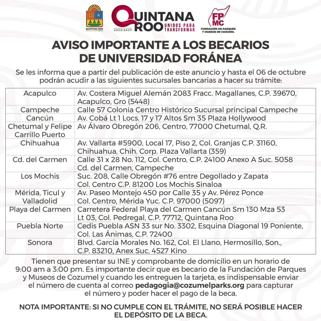 A la comunidad universitaria que estudia fuera de la Isla y tiene #beca de la #FPMC, le informamos cuáles son las sucursales donde podrán hacer el trámite de su tarjeta bancaria, en la que se realizará el pago.
