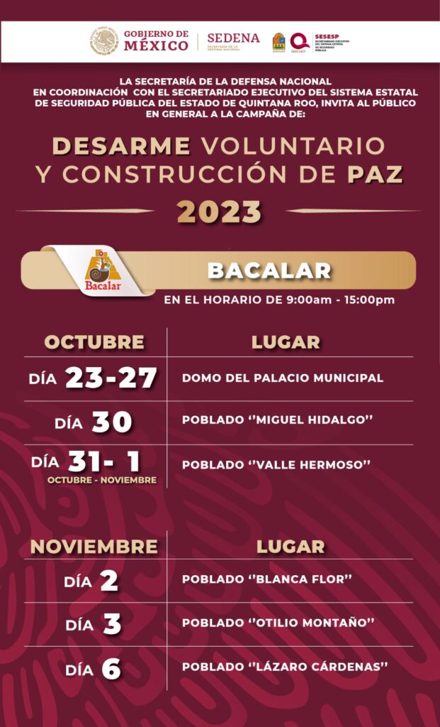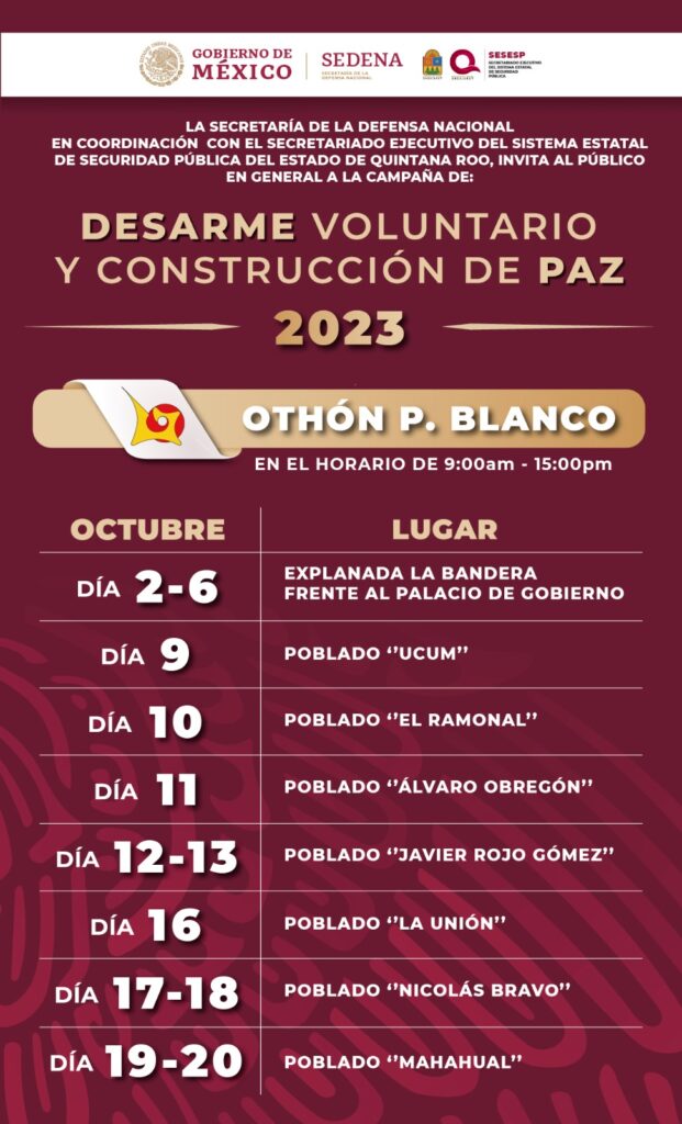Chetumal.- Par avanzar en la construcción de la paz y atender los orígenes de las violencias, se realiza la campaña “Desarme Voluntario y Construcción de Paz” en los municipios de Othón P. Blanco y Bacalar en coordinación del Secretariado Ejecutivo del Sistema Estatal de Seguridad Pública (SESESP) y la Secretaría de la Defensa Nacional (SEDENA).
