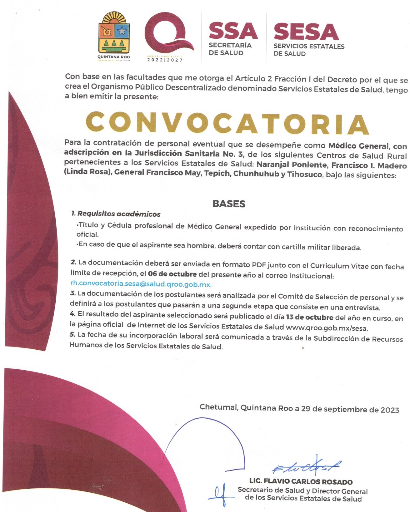 Para la contratación de personal eventual que se desempeñe como Médico General, con adscripción en la Jurisdicción Sanitaria No. 3.