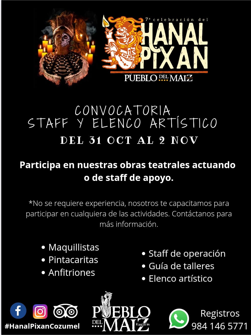 Ya viene Hanal Pixán y Pueblo del Maíz abre su convocatoria para participar en dentro del equipo que harán posible una experiencia llena de misticismo ancestral. Contáctanos para más información al teléfono anumciado