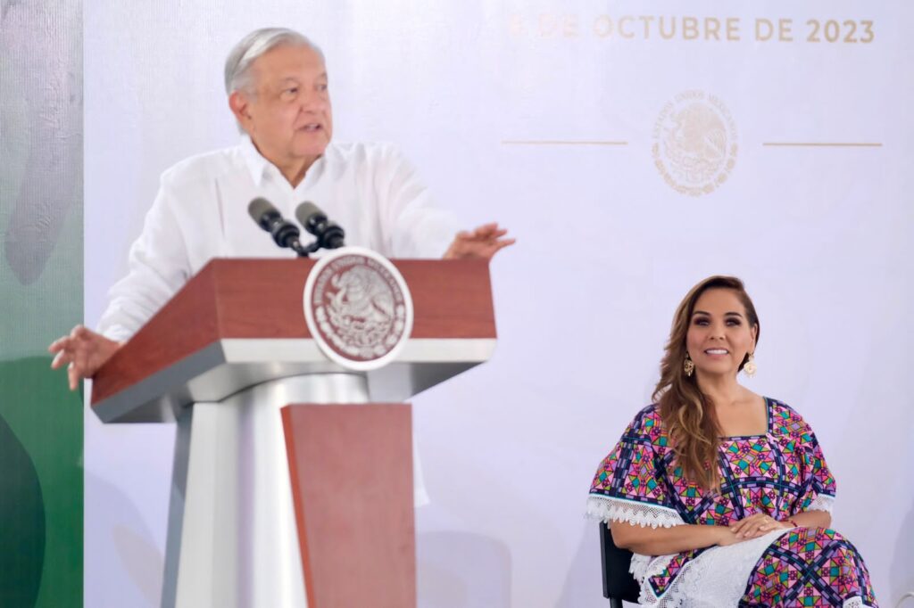 Al participar en la conferencia de prensa de la mañana que el presidente Andrés Manuel López Obrador ofreció en la estación del Tren Maya de Cancún, previo a una gira de supervisión de avances, la gobernadora Mara Lezama habló sobre los beneficios sociales y todas las obras que se generan a su alrededor.