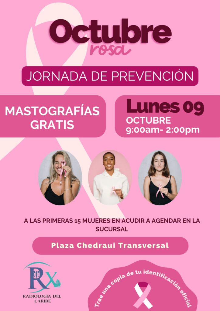 Por el mes ROSA, y como parte de la campaña de prevención, RADIOLOGÍA DEL CARIBE OFRECE 15 mastogtafías gratuitas a las primeras 15 MUJERES, que acudan a la sucursal ubicada, aún costado de Chedraui Transversal, a agendar cita para el lunes