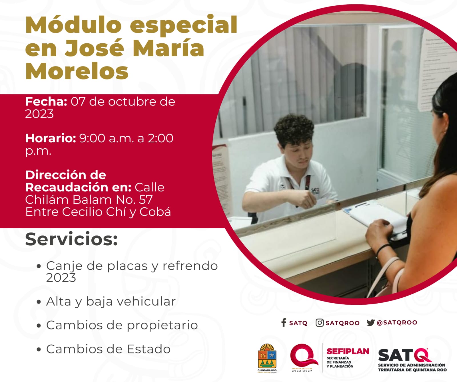 Recuerda que este sábado 07 de octubre te esperamos en José Máría Morelos con el #MóduloEspecial para trámites de emplacamiento en nuestras oficinas
