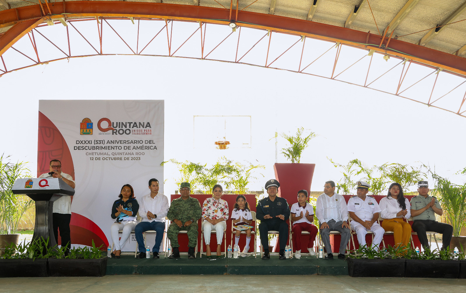 El discurso oficial corrió a cargo de Eleni Ester Borges Zavaleta, alumna del 4 Grado Grupo B turno matutino de la escuela primaria Kohunlich, quien hizo un breve recuento de los hechos que dieron origen al descubrimiento de América, ocurrido el 12 de octubre de 1492 por Cristóbal Colón, así como el alumno Iker Alberto Hau Alonzo, destacado integrante de la Escolta de Bandera, además de alumnos, maestros, personal de apoyo de la escuela y padres de familia.