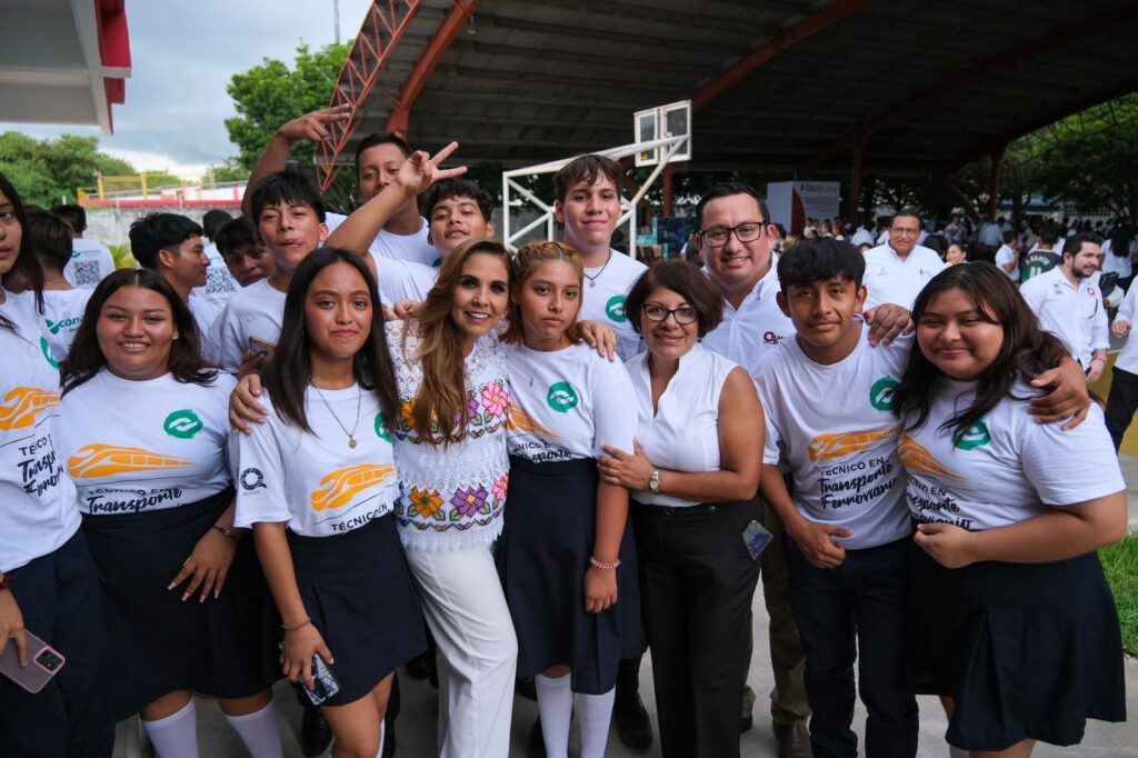 Las y los jóvenes estudiantes escucharon a Mara Lezama cuando dijo que desde el Gobierno del Estado “empujamos con mucha fuerza para que Quintana Roo se convirtiera en el único estado, de los 5 por donde pasará el Tren Maya, en ofrecer la carrera de Técnico en Transporte Ferroviario con dos especialidades: Mantenimiento General del Sistema Ferroviario y Logística de Contenedores”.