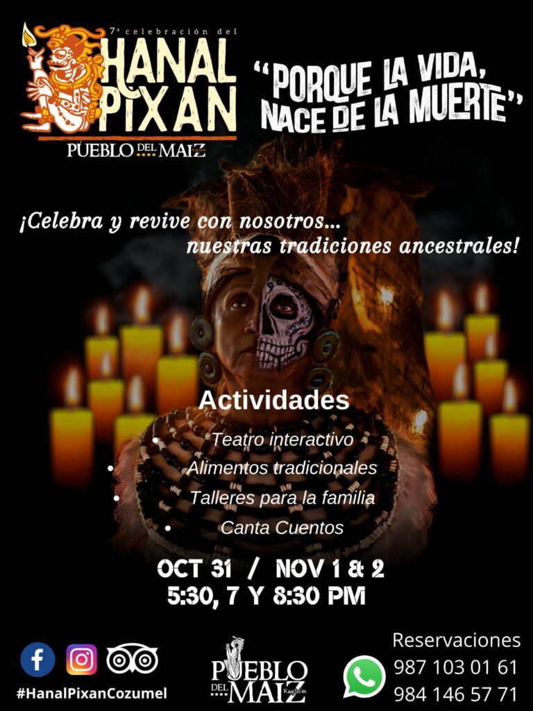 Con mucha alegría llegamos a esta 7dición de Hanal Pixan el cual se llevará a cabo del 31 de octubre al 2 de noviembre con 3 horarios de recorridos: 5:30, 7 y 8:30pm en las instalaciones de Pueblo del Maíz, contando con 2 obras de teatro, la presentación de Brigi Canta cuentos, los talleres de elaboración de calaveras de amaranto y una clase de cocina del PIB; y por supuesto la delicia de la gastronomía local de Hanal Pixán.