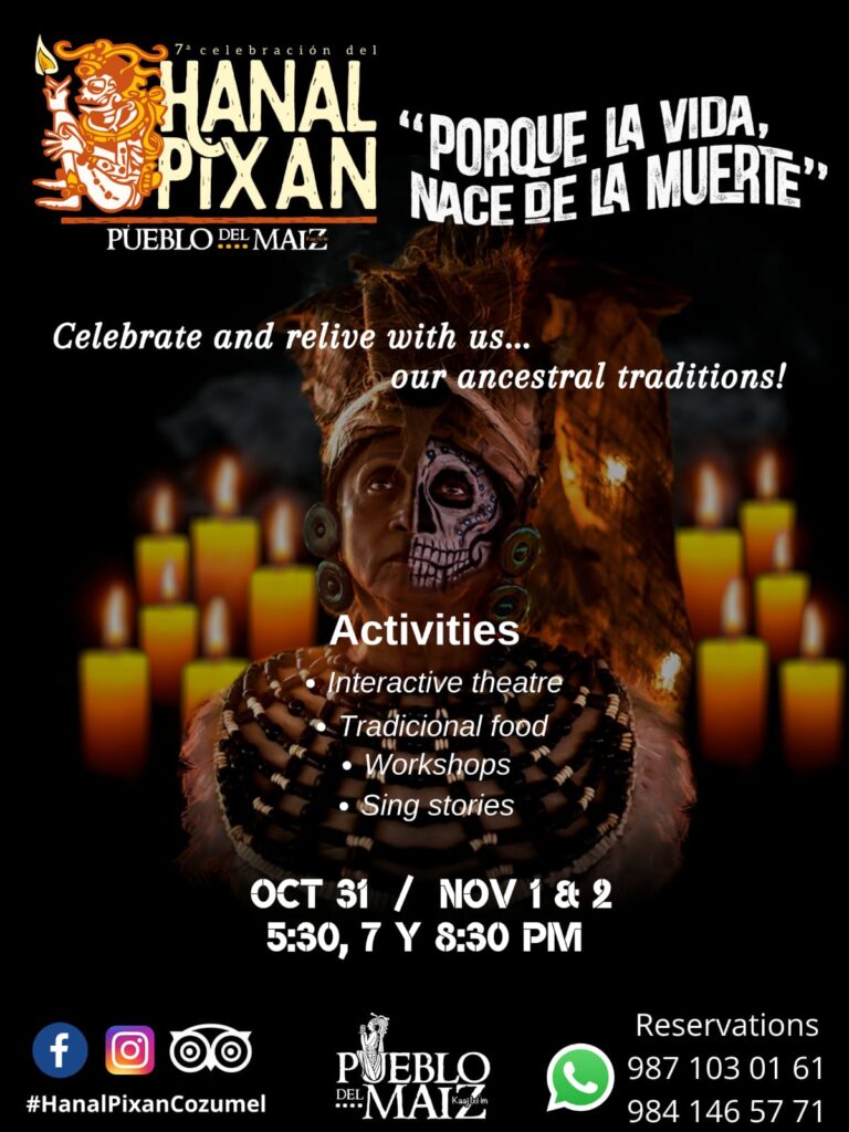 Es momento de despertar, es el llamado a las ánimas, las puertas de Xibalbá están próximas a abrirse y las ofrendas esperarán en el camino de las velas, el aroma de la flor de Xpujuk y el copal serán sus guías, pues es nuestra tradición, ya es tiempo de Hanal Pixán en Pueblo del Maíz. Las leyendas de Xibalbá cobran vida una vez más gracias a la participación de la comunidad de nuestra Isla Cozumel.