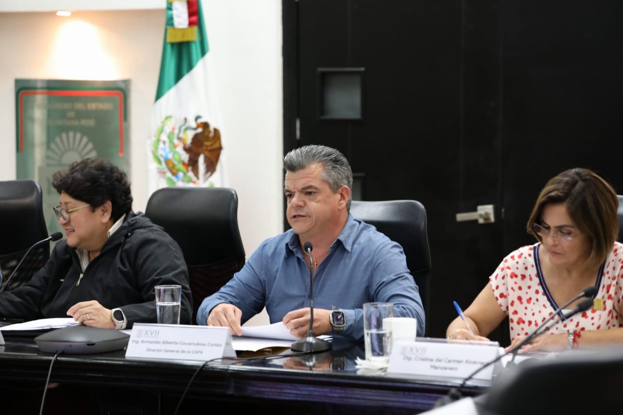Chetumal.- En el marco de la ampliación de la glosa del Primer Informe de Gobierno de la gobernadora Mara Lezama Espinosa, el director general de la Comisión de Agua Potable y Alcantarillado (CAPA), Alberto Covarrubias Cortés, compareció ante las diputadas y diputados de la Comisión de Desarrollo Urbano Sustentable y Asuntos Metropolitanos de la XVII Legislatura del Congreso del Estado.