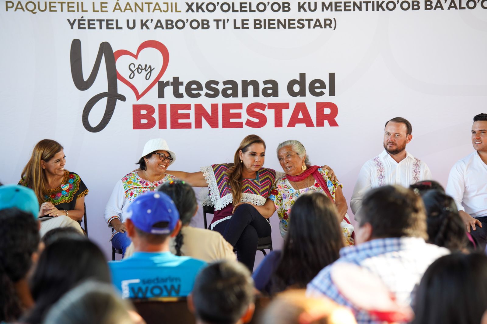 La artesana Teresa de Jesús España agradeció el apoyo a nombre de sus compañeras y compañeros, quien junto con Samuela Puc Uc recibió sus paquetes de insumos de manos de la gobernadora Mara Lezama, con quienes inició la distribución.