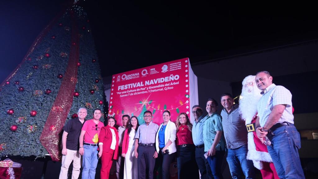 Chetumal.- Con el fin de fomentar y promover espacios de sana convivencia, dirigidos a todo el sector educativo, en el marco del Programa Estatal de Cultura de Paz, se llevó a cabo el festival navideño “Por una Cultura de Paz”, y Encendido del Árbol, en la plaza cívica de la Secretaría de Educación de Quintana Roo (SEQ).