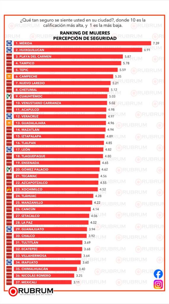 El estudio, realizado entre el 2 y el 7 de junio de 2025, evaluó la percepción ciudadana sobre diversos temas, entre ellos la seguridad, donde Playa del Carmen se colocó en el cuarto lugar general y el tercero entre los municipios más seguros con alcaldesas.