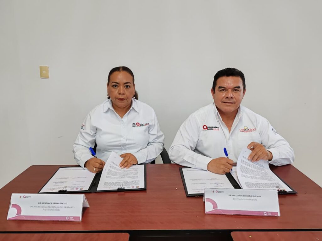 Chetumal.- La encargada de la Secretaría del Trabajo y Previsión Social (STyPS) del estado, Verónica Salinas Mozo y el rector de la Universidad Intercultural Maya de Quintana Roo (UIMQROO), William Briceño Guzmán firmaron un convenio de colaboración para el desarrollo de proyectos y ejecución de acciones conjuntas.