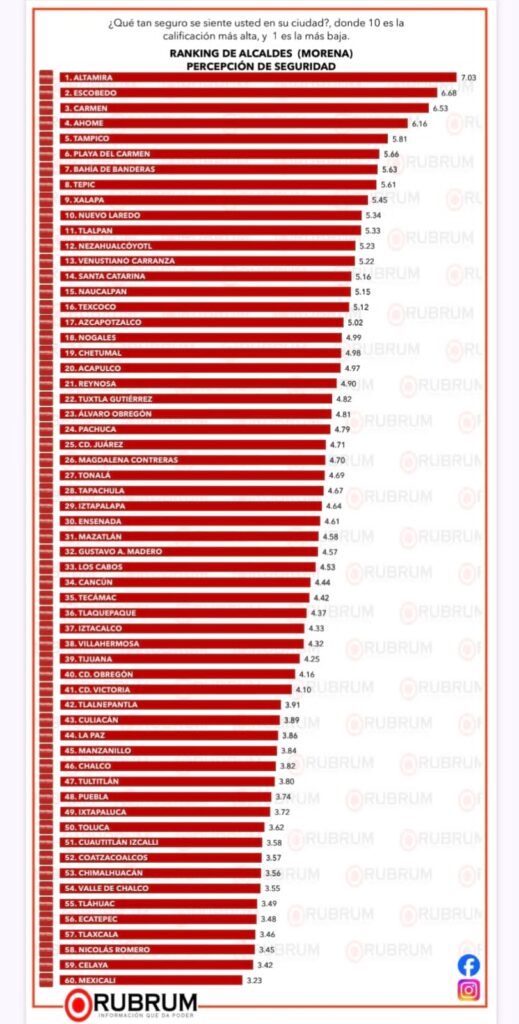 El municipio de Playa del Carmen, bajo el liderazgo de la presidenta municipal Estefanía Mercado, alcanzó el sexto lugar nacional en percepción de seguridad dentro del más reciente ranking de alcaldías de Morena, elaborado por Rubrum en agosto de 2025.
