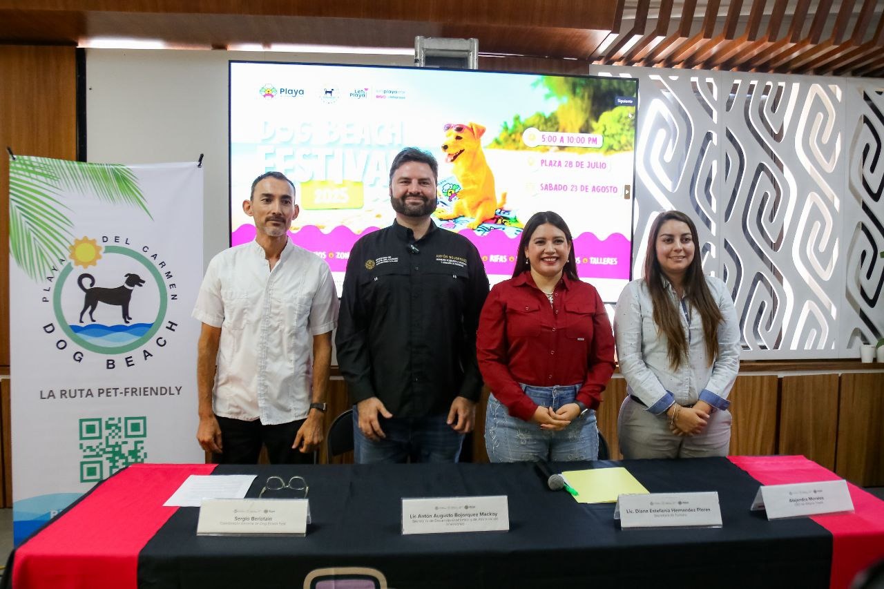 Playa del Carmen, Quintana Roo, 20 de agosto de 2025.- El gobierno de Playa del Carmen, que encabeza la presidenta municipal Estefanía Mercado, anunció en conferencia de prensa la realización del “Dog Beach Festival”, que se llevará a cabo el sábado 23 de agosto en la Plaza 28 de Julio, en horario de 5 de la tarde a 10 de la noche.