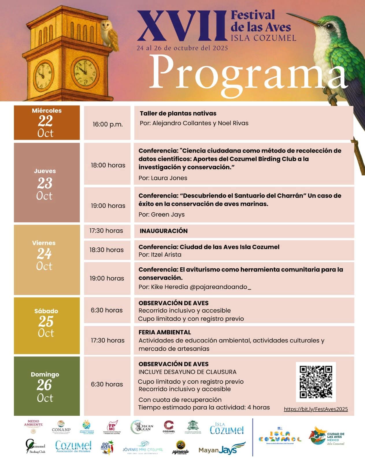 El festival contará con un taller de plantas nativas, además de conferencias como Ciencia ciudadana como método de recolección de datos científicos, Descubriendo el Santuario del Charrán, Ciudad de las Aves Isla Cozumel y El aviturismo como herramienta comunitaria para la conservación. También se realizarán actividades de observación de aves y la tradicional Feria Ambiental.