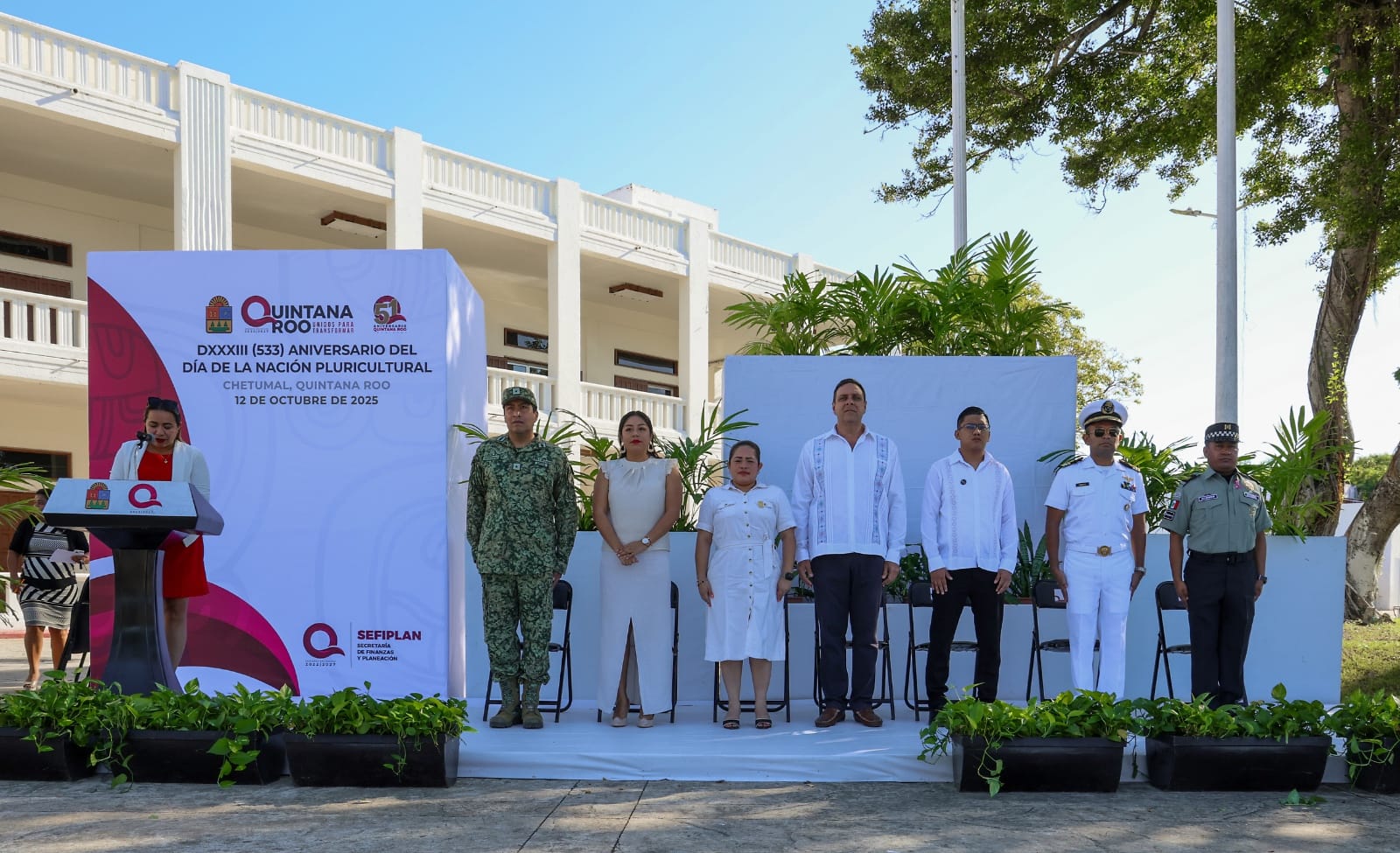 Chetumal.- En la capital del estado se conmemoró el 533 aniversario de la Nación Pluricultural, mediante una ceremonia cívica organizada por el Gobierno de Quintana Roo, a través de la Secretaría de Finanzas y Planeación (SEFIPLAN), en la plaza cívica frente al Palacio de Gobierno.