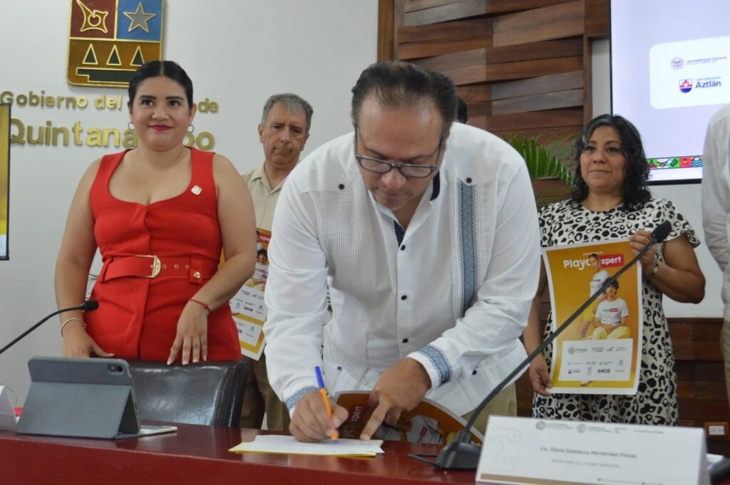 En este marco, se llevó a cabo la firma del acuerdo de cooperación entre el municipio de Playa el Carmen a través de la Secretaria de Turismo y la Universidad Riviera, el Tecnológico Universitario Playacar, el Centro Universitario Inglés, la Universidad Vizcaya de las Américas, la Universidad Tecnológica de la Riviera Maya, la Universidad Autónoma de Quintana Roo, la Universidad Interamericana Para El Desarrollo, la Universidad Aztlán, la Earth & Life University y la Universidad Para El Bienestar Benito Juárez García.