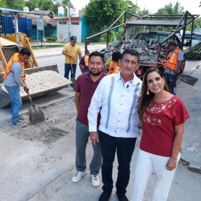 Acompaña Mara Lezama a José Alfredo Contreras en supervisión de bacheo, una obra municipal en Bacalar