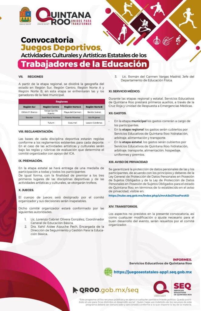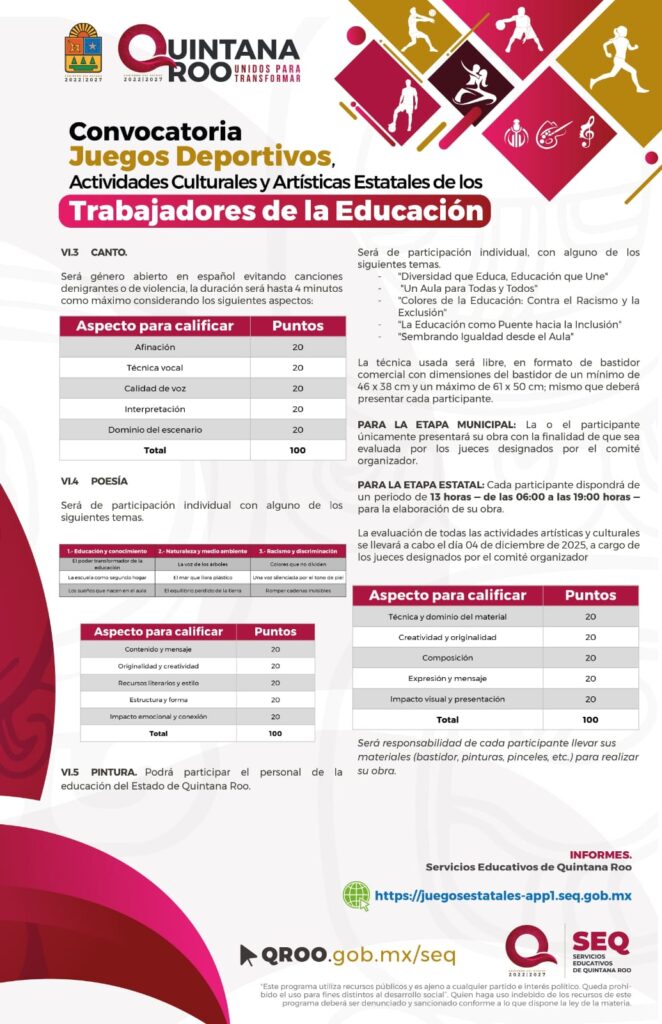 Los juegos incluyen las disciplinas deportivas de fútbol, voleibol, basquetbol, así como folclor, pintura, canto y poesía, destacando la colaboración de la Comisión del Deporte de Quintana Roo, Instituto de Cultura y las Artes de Quintana Roo, Departamento de Educación Física, supervisores de Educación Física, Enlaces de la SEQ en los municipios, promotores y personal administrativo, subrayó.