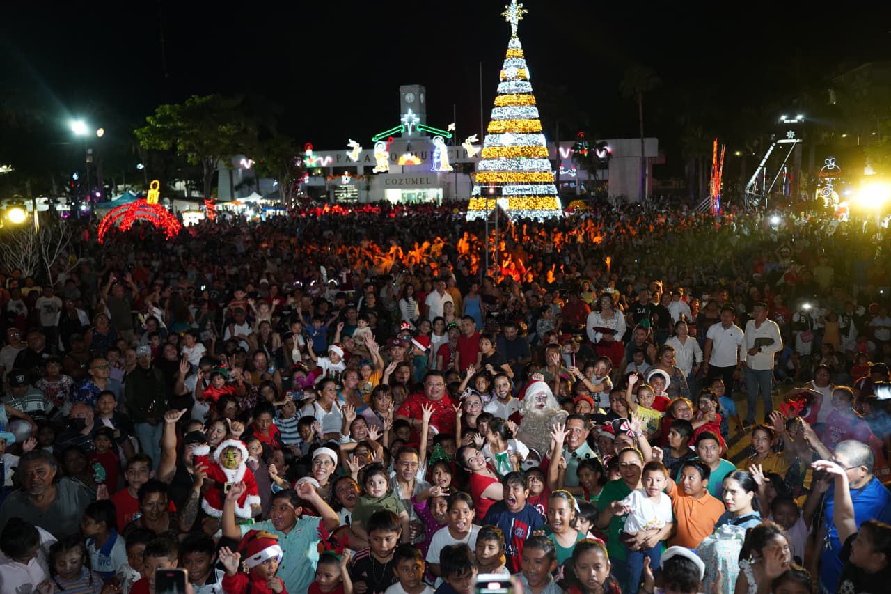 Cozumel, a 6 de diciembre de 2025.- El segundo festival navideño “Mar de estrellas” dio inicio con el brillante encendido de luces del árbol y del parque Quintana Roo, donde un majestuoso escenario en tonos rojos, dorados y verdes, acompañado de enormes cajas de regalo y la villa de la Navidad, creó un ambiente mágico que invitó a las familias a capturar las mejores postales de recuerdo. Entre música, color y espíritu decembrino, Cozumel vivió una noche llena de tradición y alegría.